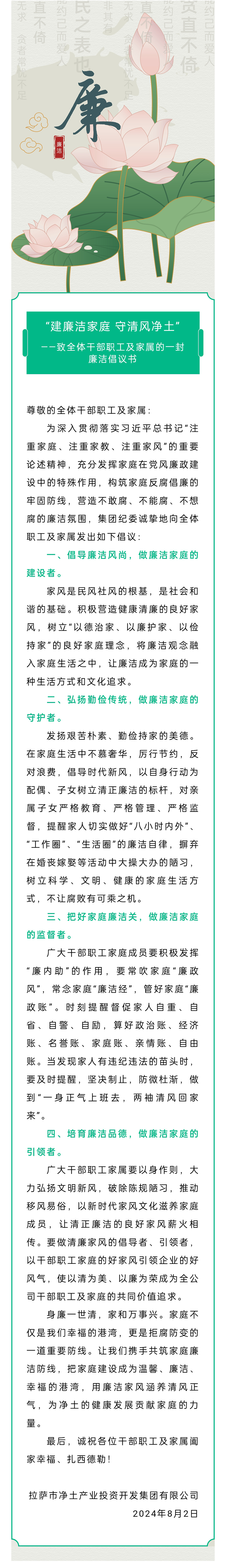 “建廉潔家庭 守清風(fēng)凈土”——致全體干部職工及家屬的一封廉潔倡議書